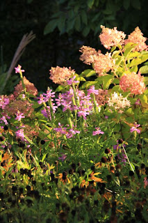 Echinacea purpurea, dépouillée de ses pétales, attend la visite des chardonnerets, tandis qu'hydrangea paniculata 'Phantom' joue les dentelles en contre-jour